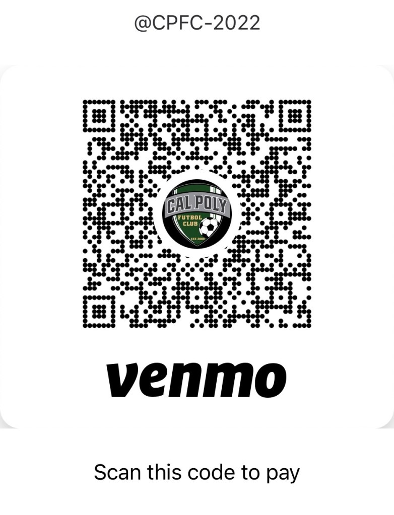 To purchase this limited supply of vintage jerseys, email the club president, Fiona Plunkett to fplunket@calpoly.edu to confirm that the jersey you want is in stock*. Then VENMO the donation amount to @CPFC-2022. See the QR code below. If you wish to send a check, please make it out to ASI.